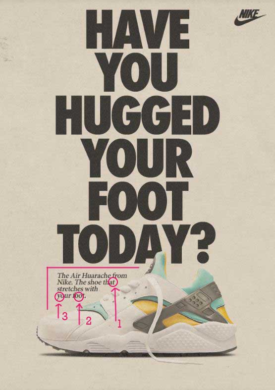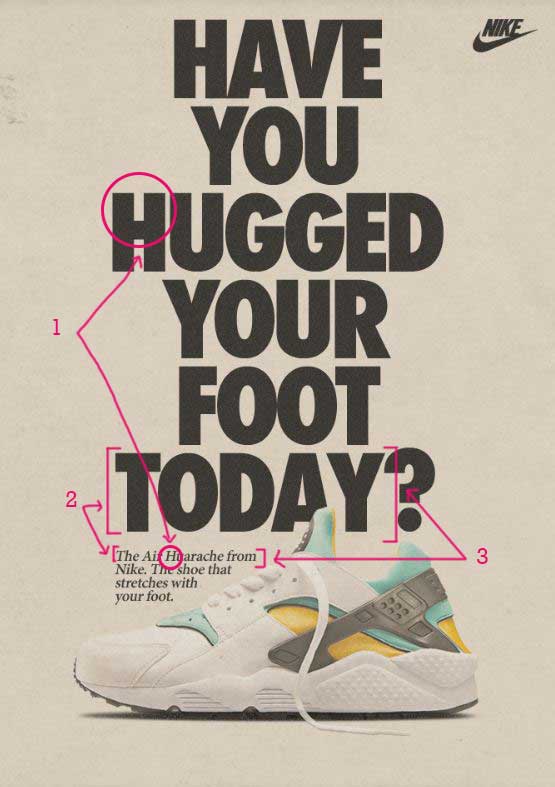 Typography is an important part of design. It is essential to include contrasting, but not conflicting elements in your typography choices. Things to pay attention to are size, weight, structure, form, direction, and color. As you add these contrasting elements into your typography design, you can have advertisements that are still relevant over 20 years later, as Nike does with this ad.